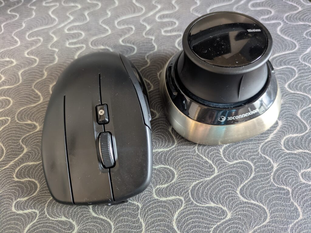 SpaceMouseは画像の右側の円柱型のマウスで特に3次元の回転と移動が得意なデバイスです.実際に使用し慣れるまで時間は有しますが,慣れるとかなり意のままに操作できるようになりました.またソフトで細かい操作設定ができ,自分の使い方に合った設定ができます.
